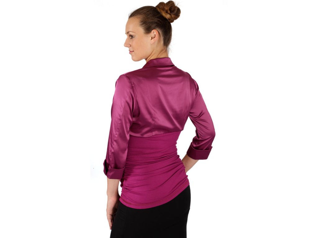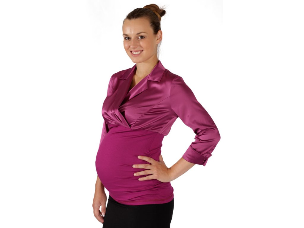 Veľmi elegantná tehotenská blúzka, vhodná aj ako dojčiaca. Predný diel zatiahnutý pod prsiami, s viackrát cez seba preloženou rozhalenkou. Na zadnom diele odšité krátke záševky. Dolná časť je z viskózového úpletu, do bočných švov všitá gumička, ktorá vytvára riasenie a voľnosť pre rastúce bruško. Má 3/4 rukávy ukončené manžetou.Je vyrobená z ľahkého pružného a splývavého saténu.
