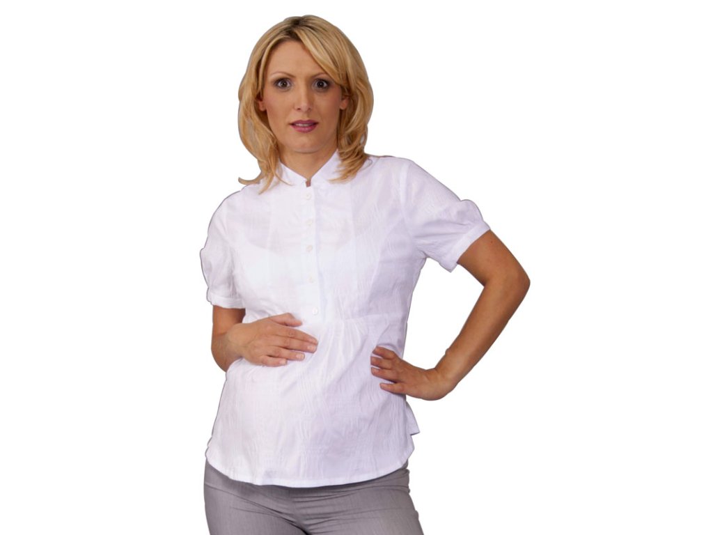 Tehotenská košeľová blúzka z veľmi príjemného elastického zmesového bavlneného materiálu s plastickým vzorom. Blúzka so stojačikom a krátkou légou na prednom diele, je zatiahnutá pod prsiami, spodný diel je ľahko nariasený, čím vznikne voľnosť pre rastúce bruško. Krátky rukáv je ľahko nariasený do úzkej manžety na gombík. Do členiacich švov predného dielu sú všité viazačky pre možnosť regulácie obvodu pásu.