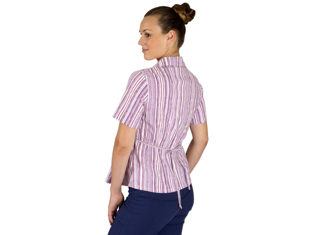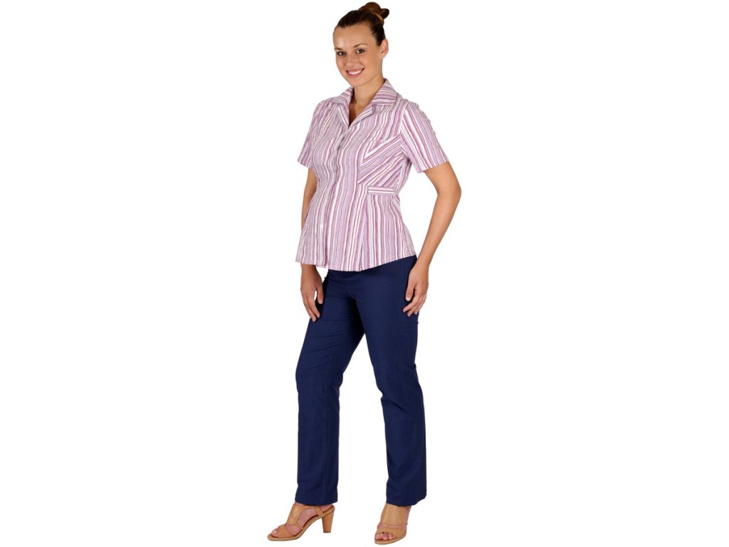 Tehotenská blúzka s rozhalenkou a krátkym rukávom. Predné diely sú členené so záhybmi. Zadný diel je hladký.