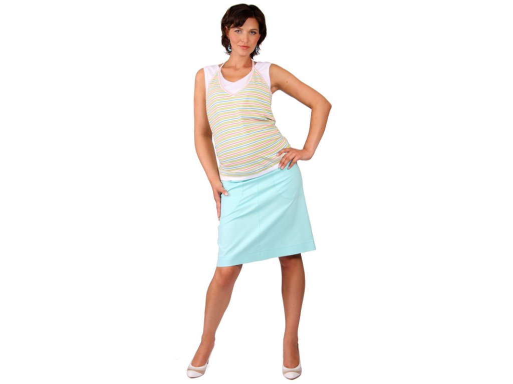 Tehotenská sukňa v siluete A. Na predných dieloch sú nakladané vrecká. Sukňa môže mať nízky alebo vysoký pás.