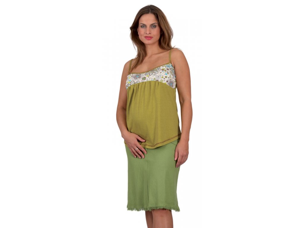 Tehotenská sukňa áčkového strihu. Členená na štyri diely. Dolný okraj je ozdobne nezašitý a prešitý. Dĺžka sukne pod kolená.