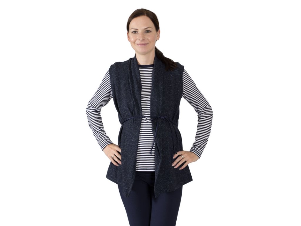 Univerzálna hrejivá zavinovacia vesta so šálovým golierom a zaväzovaním. Z veľmi príjemného materiálu s vysokým obsahom vlny a hodvábu. Cez ľahkosť materiálu je vesta veľmi teplá. Vďaka zavinovaniu ju veľmi dobre využijete aj po tehotenstve. V bokoch sú všité malé pútka pre viazačky.