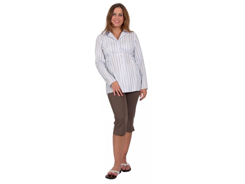 Klasické úzke tehotenské 3/4 nohavice s krátkymi rozparkami v bočných švoch. V páse sú len s nízkym pásom.