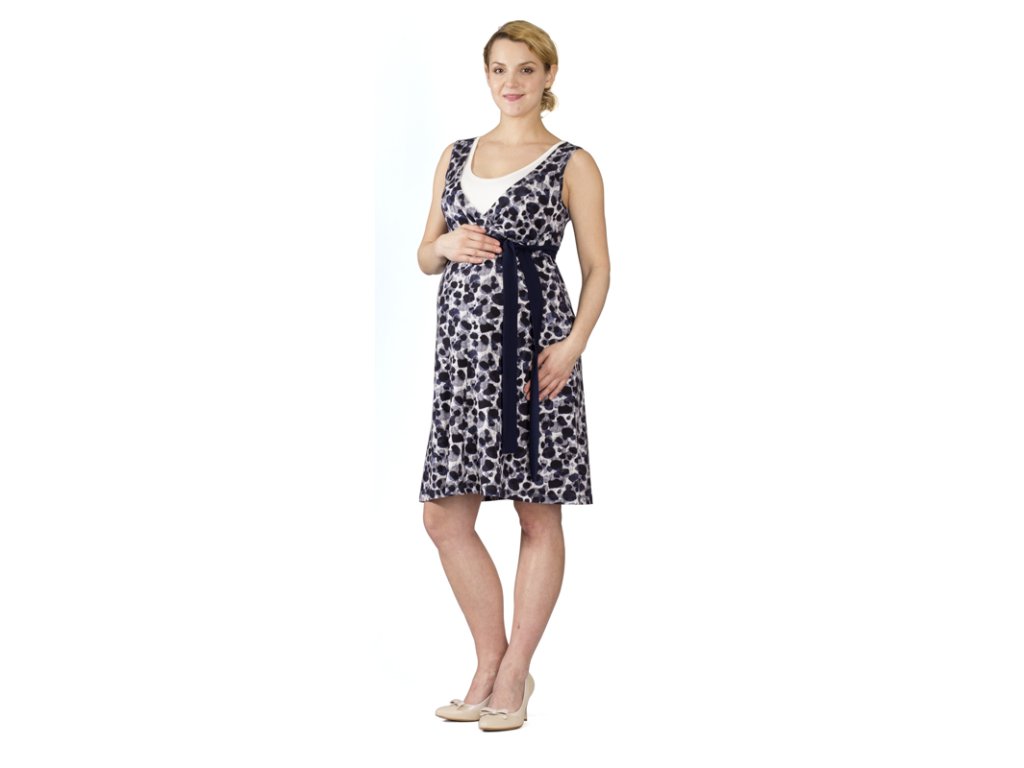 Tehotenské a dojčiace šaty so širokými ramienkami a dĺžkou nad kolená. Predný diel je pod prsiami prestrihnutý, priekrčník je do tvaru V - pod vrchný materiál je vsadená vsadka, ktorá umožňuje dojčenie. Všitá viazačka v páse. Šaty sú vhodné ako na slávnostnú príležitosť tak na bežné nosenie.