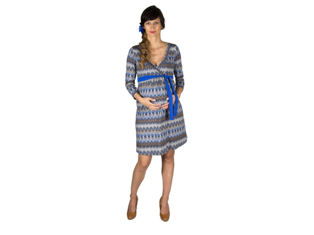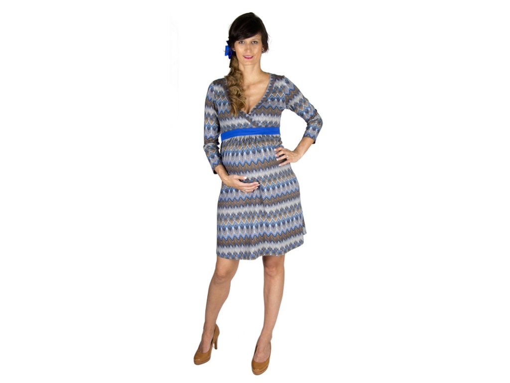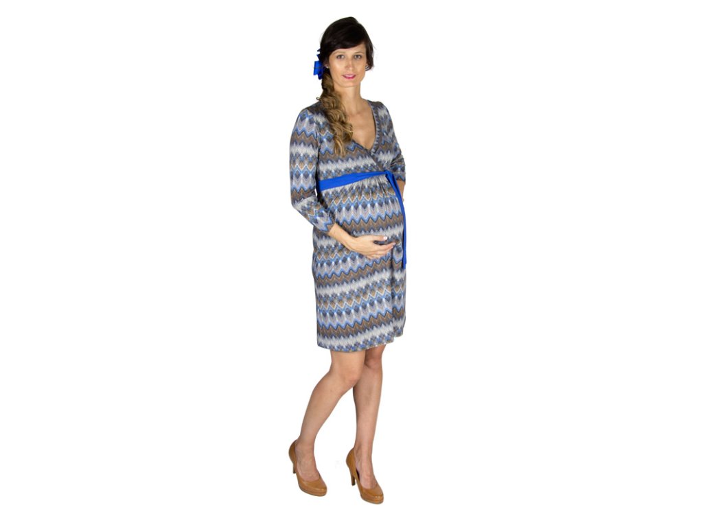 Veľmi príjemné tehotenské a dojčiace šaty voľnejšej siluety v dĺžke ku kolenám. S preloženým výstrihom do V, ktorý je zapravený širším lemom a s 3/4 rukávmi.