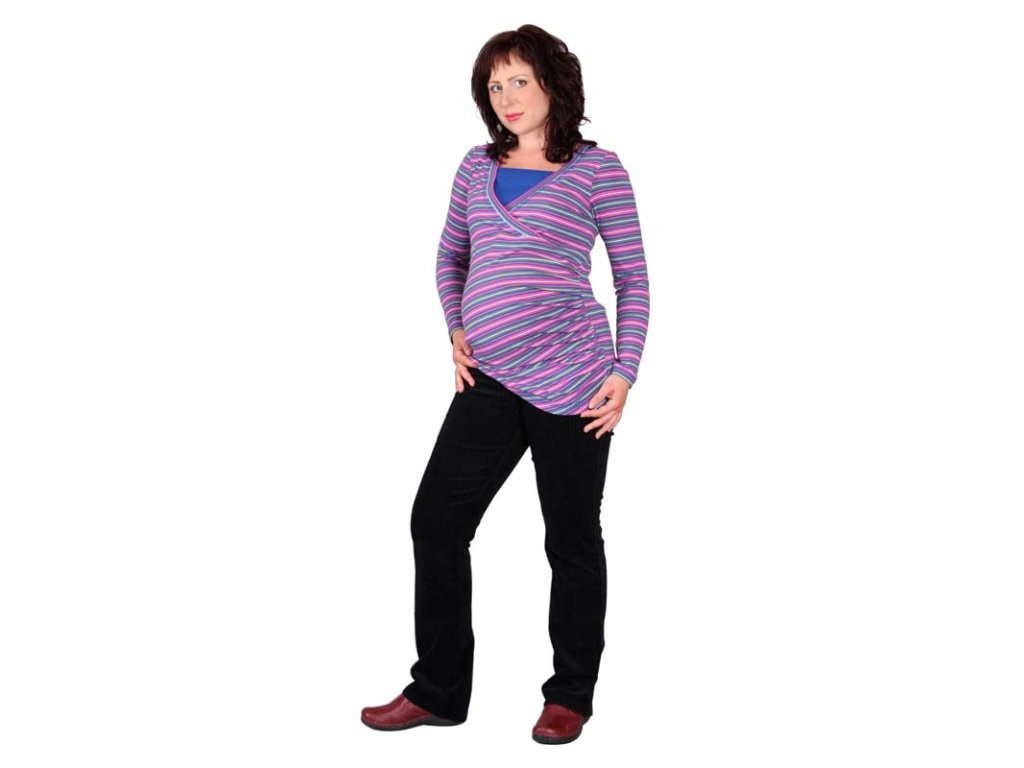 Veľmi pohodlné dojčiace tričko podstrihnuté pod prsiami, živôtiková časť s preloženým výstrihom do V a širšom lemovaním. Vsadka kontrastnej farby má menší mierne okrúhly výstrih. Brušná časť je nariasená do ľavého bočného švu, čím vznikne dosť priestoru aj pre veľké bruško a zároveň vytvára veľmi zaujímavý efekt padajúcich prúžkov. Má dlhé rukávy. Je vyrobené z originálneho bavlneného prúžku s prímesou lycry.