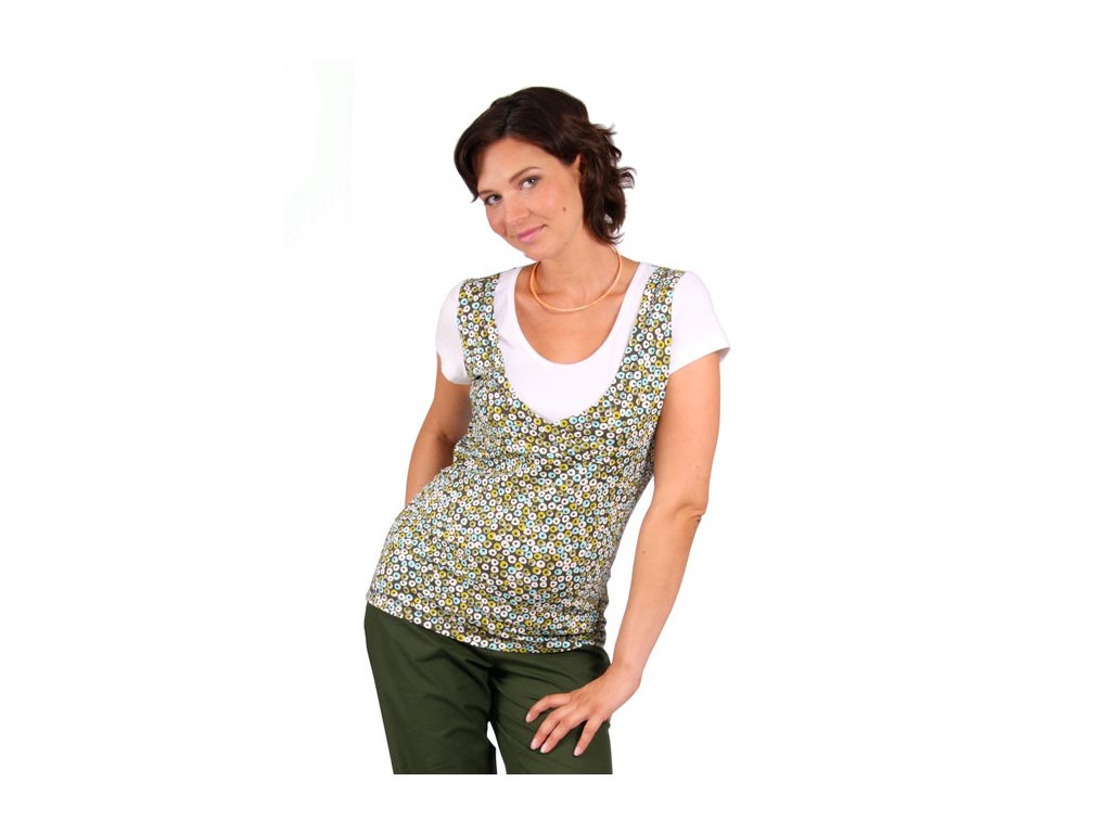 Dojčiace a tehotenské tričko s krátkym rukávom. Rukávy a vsadka vrchného predného dielu sú z jednofarebného materiálu. Predný diel je členený pod prsiami. Vrchný predný diel tvorí výstrih do tvaru V. Dá sa objednať aj v ružovom prevedení viz detail materiálu.