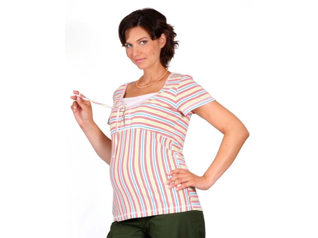 Dojčiace tričko s krátkym rukávom. Predný diel je členený pod prsiami, priekrčník je olemovaný lemovacím prúžkom, ktorý je predĺžený a zaväzuje sa. Vrchný predný diel je dvojitý, čo umožňuje pohodlné kojenie.