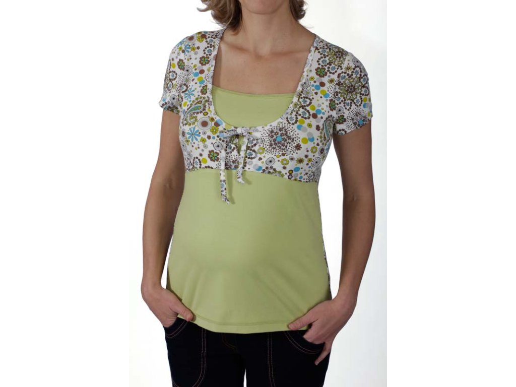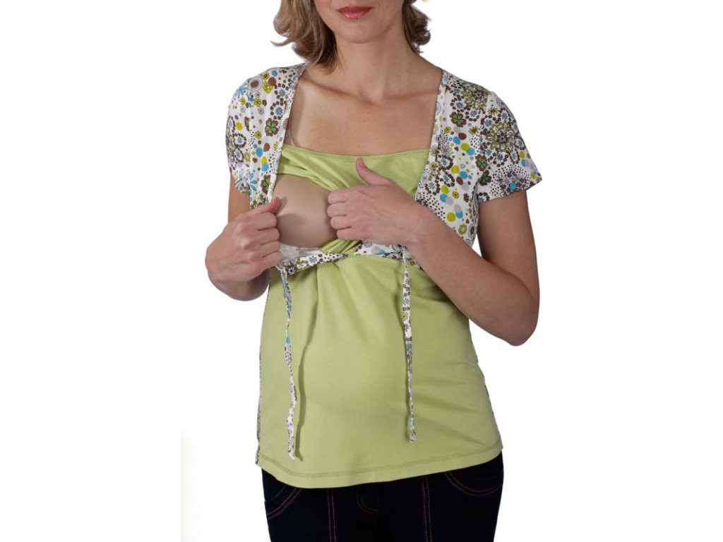 Dojčiace tričko s krátkym rukávom. Predný diel je členený pod prsiami, priekrčník je olemovaný lemovacím prúžkom, ktorý je predĺžený a zaväzuje sa. Vrchný predný diel je dvojitý, čo umožňuje dojčenie.