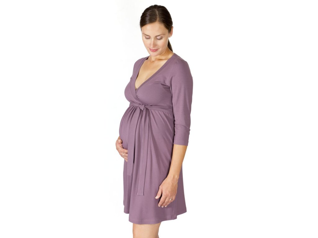 Veľmi príjemné tehotenské a dojčiace šaty voľnejšie siluety v dĺžke ku kolenám. S preloženým výstrihom do V, ktorý je zapravený širším lemom a 3/4 rukávmi.