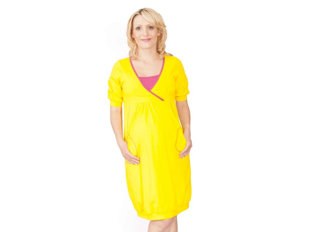 Tehotenské a dojčiace šaty športového strihu z veľmi príjemného pevnejšieho bavlneného úpletu s kontrastnými doplnkami a prešívaním. Predný diel podstrihnutý pod prsiami, vrchná časť s hlbokým, ľahko preloženým výstrihom do V, olemovaný kontrastným lemom, podložený vsadkou z kontrastného materiálu. Sukňová časť je pod prsiami nariasená a členená bočnými dielikmi, do ktorých sú včlenené vrecká. Zadný diel so stredovým švom, rukávy sú v dĺžke k lakťu a rovnako ako dolný kraj všité do manžety. Vhodné ako vychádzkový alebo aj domáci odev.