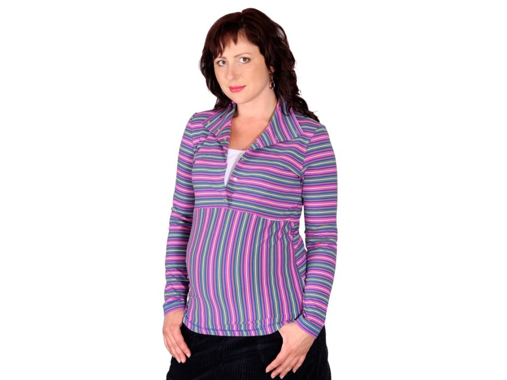 Veľmi pohodlné dojčiace tričko podstrihnuté pod prsiami, živôtiková časť so stojačikom a kontrastnou vsadkou, zapínaná na cvočky. Má áčkový strih s miernym predĺžením predného dielu a dlhými rukávmi. Je vyrobené z originálneho bavlneného prúžku s prímesou lycry.