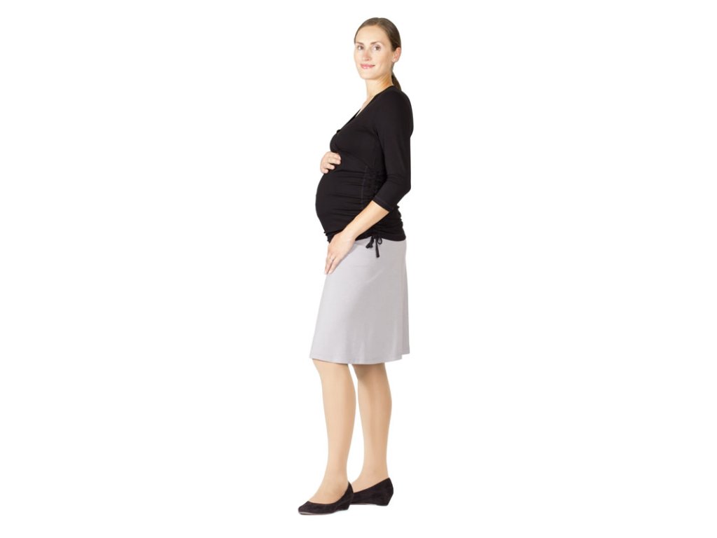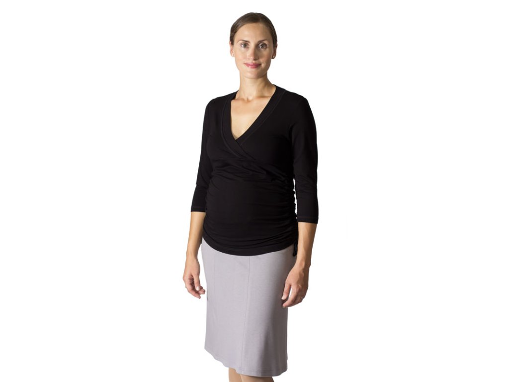 Veľmi príjemné tehotenské a dojčiace tričko s prekríženým výstrihom do V a 3/4 rukávmi. Cez predný aj zadný diel podstrihnuté pod prsiami av spodnej časti so sťahovaním. Podľa stiahnutia viazačiek si určíte dĺžku trička a mieru riasenia.