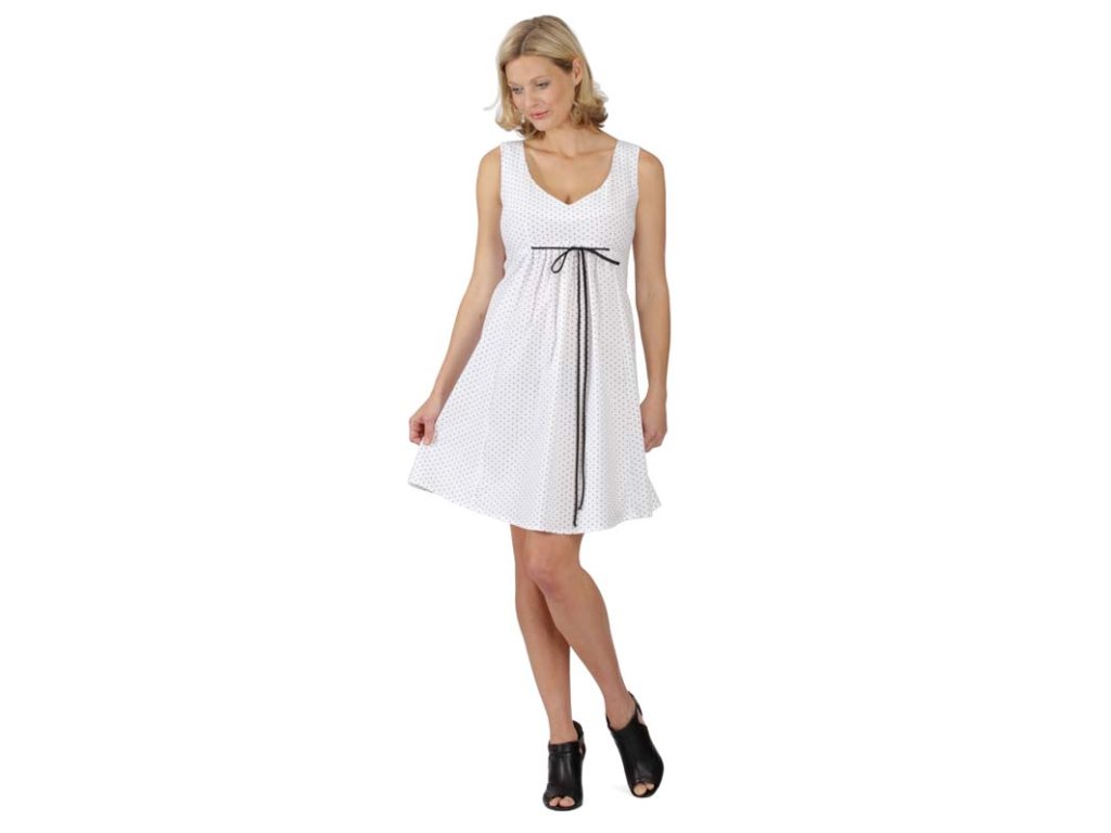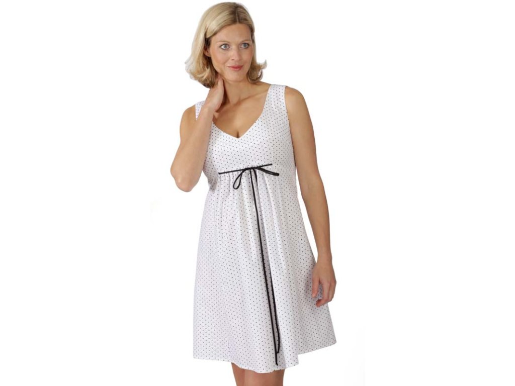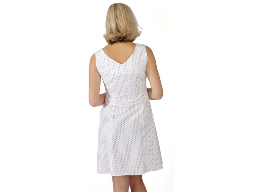 Veľmi elegantné bodkované šaty so širšími ramienkami a výstrihom do V. Živôtiková časť je tvarovaná tak, že cez predný diel je podstrihnutá pod prsiami a smerom do zadného dielu sa postupne znižuje k línii pásu. Sukňová časť je pod prsiami nariasená na bruško pre väčšie pohodlie a je tvorená zo šiestich postupne sa rozširujúcich dielov. V ľavom bočnom šve je skrytý zips. Sú vyrobené z veľmi príjemného a ľahkého zmesového materiálu. Hoci materiál neobsahuje lycru, je pružný.