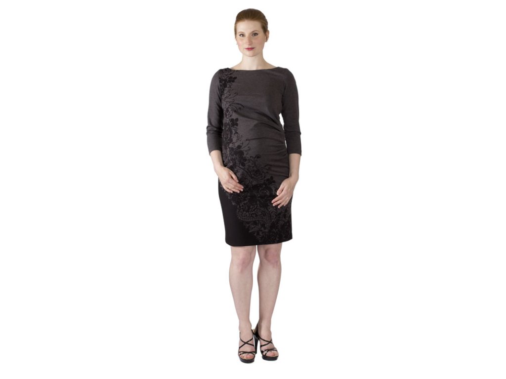 Veľmi pohodlné šaty s okrúhlym výstrihom a 3/4 rukávmi. Predný diel je v oblasti bruška nariasený, čím vznikne priestor pre bruško. Sú vyrobené z teplejšej a splývavej zmesovej pleteniny s abstraktným vzorom s bordúrou.