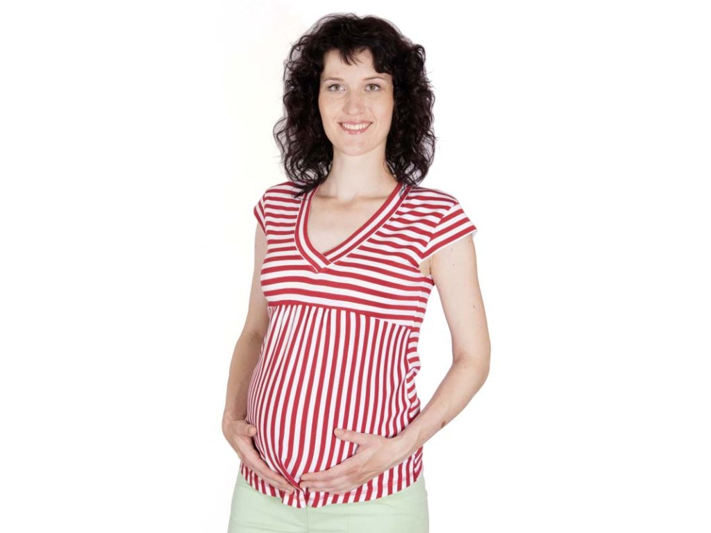 Veľmi príjemné tehotenské tričko s výstrihom do V a širokým lemom. Predný diel je členený sedlom pod prsiami, kde je riasenie pre vytvorenie voľnosti pre bruško. Spodná časť predného dielu je orientovaná vertikálne a opticky zužuje. Použitý materiál je elastický, čo zaisťuje prispôsobenie postave. Zadný diel je hladký, prúžky sú orientované kolmo na predný diel.