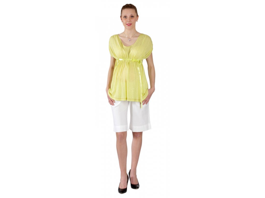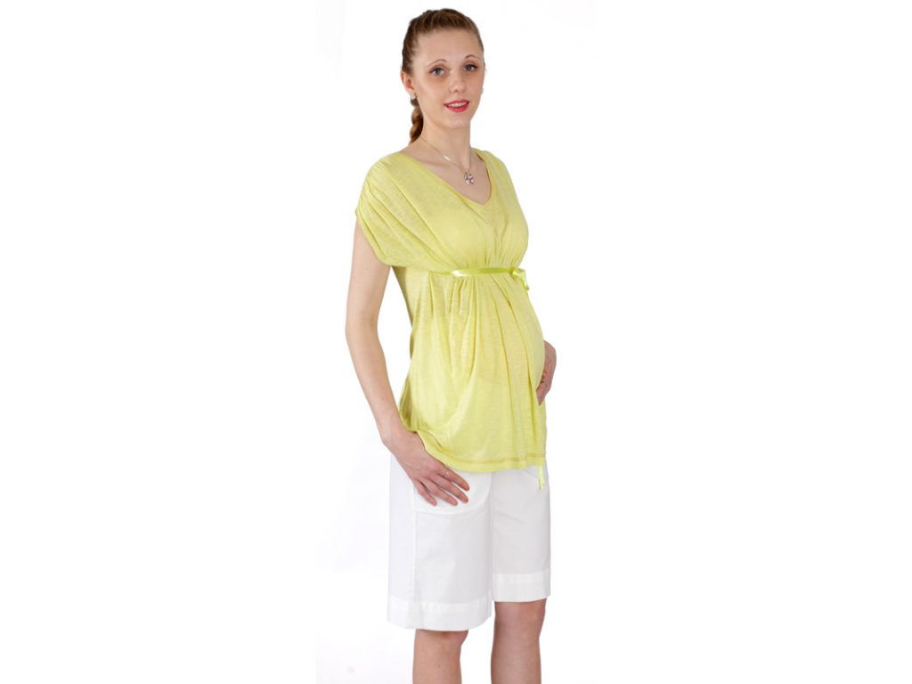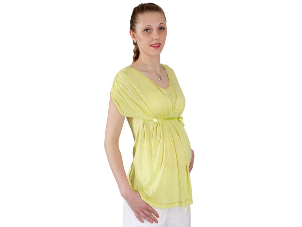 Ľahké tehotenské tričko voľnej siluety v sviežej zelenej farbe. Na predných dieloch je v ramennej časti riasenie, do bočných švov všité viazačky pre reguláciu obvodu pásu. Tričko využijete aj po období tehotenstva. Je vhodné pre ako na každodenné nosenie, tak aj na slávnostnú príležitosť.