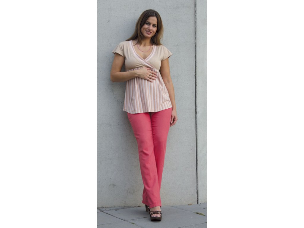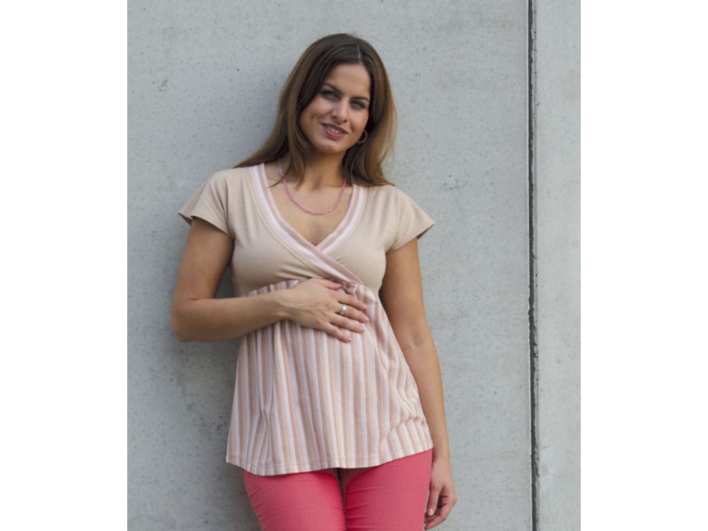 Tehotenské tričko s výstrihom do V a spadnutým rukávom. Tričko je na prednom diele prestrihnuté pod prsiami, vytvorené sklady, čím vzniká voľnosť pre rastúce bruško. Výstrih je riešený prekrížením vrchných predných dielov, a tým vzniká možnosť využitia tričká i po pôrode, pre dojčenie.