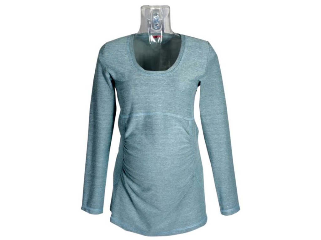 Tehotenské tričko s dlhým rukávom. Predný diel má vodorovné členenie pod prsiami a zvislé po bokoch, do ktorého je predný diel nabraný pre voľnosť pre rastúce bruško. Členenie je ozdobne prešité. Priekrčník je zapravený širším lemom.