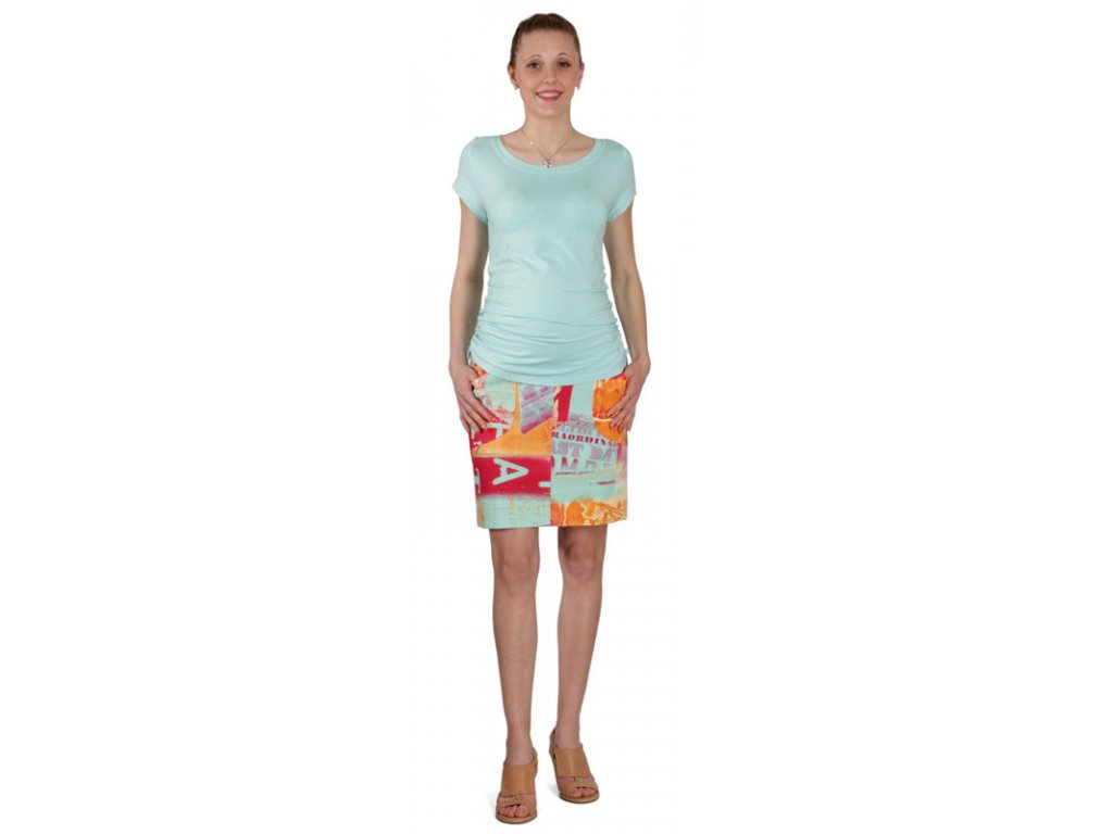 Tehotenské tričko s okrúhlym výstrihom a krátkymi rukávmi. Predný diel je prestrihnutý pod prsiami. V bočných švoch je všitá šnúrka na sťahovanie a tým aj vytváranie voľnosti pre bruško.