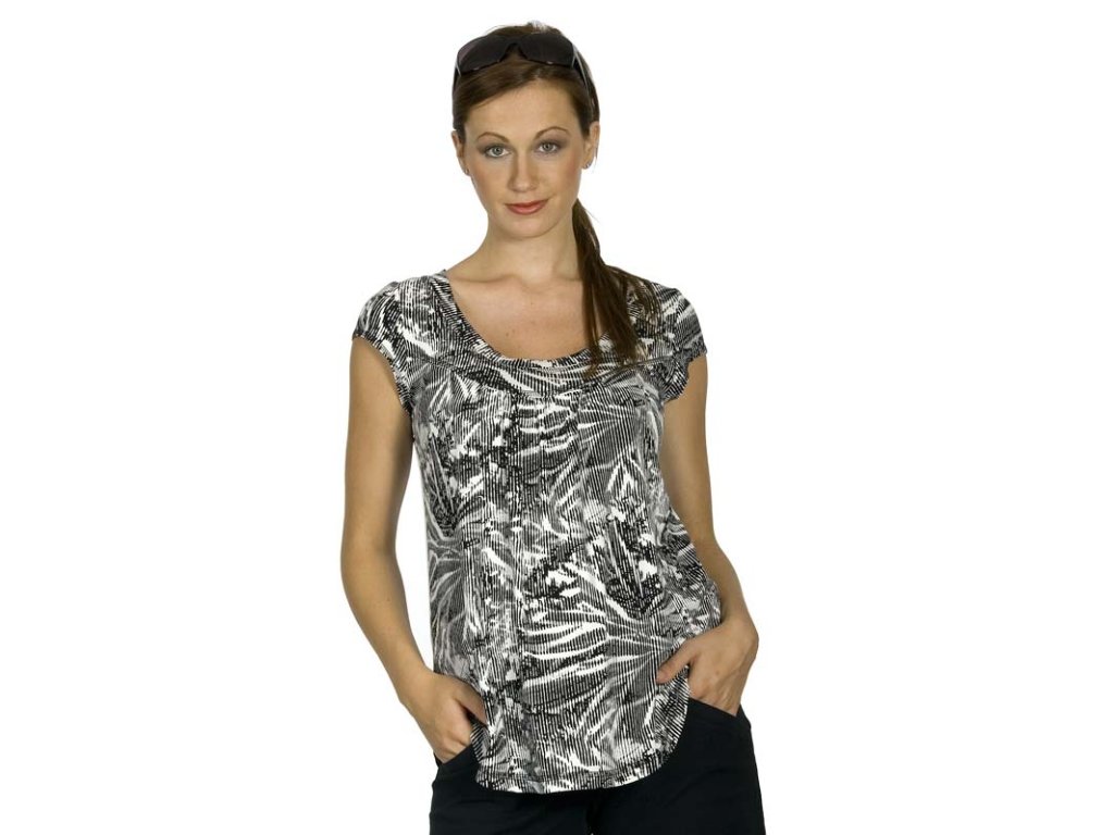 Tehotenské tričko s krátkym rukávom a okrúhlym výstrihom. Predný diel je okolo priekrčníku tvarovaný sedlom, prestrihnutý, nariasený a tým je vytvorená voľnosť pre bruško.