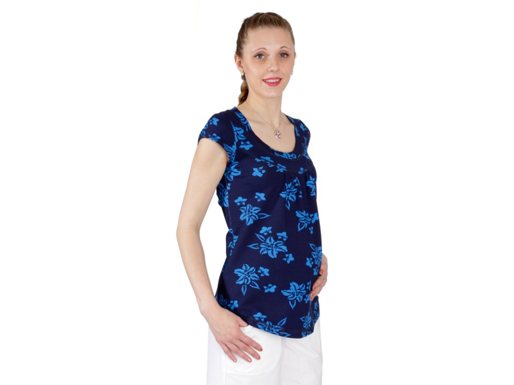 Tehotenské tričko s krátkym rukávom a okrúhlym výstrihom. Predný diel je okolo priekrčníku tvarovaný sedlom, prestrihnutý, nariasený a tým je vytvorená voľnosť pre bruško.