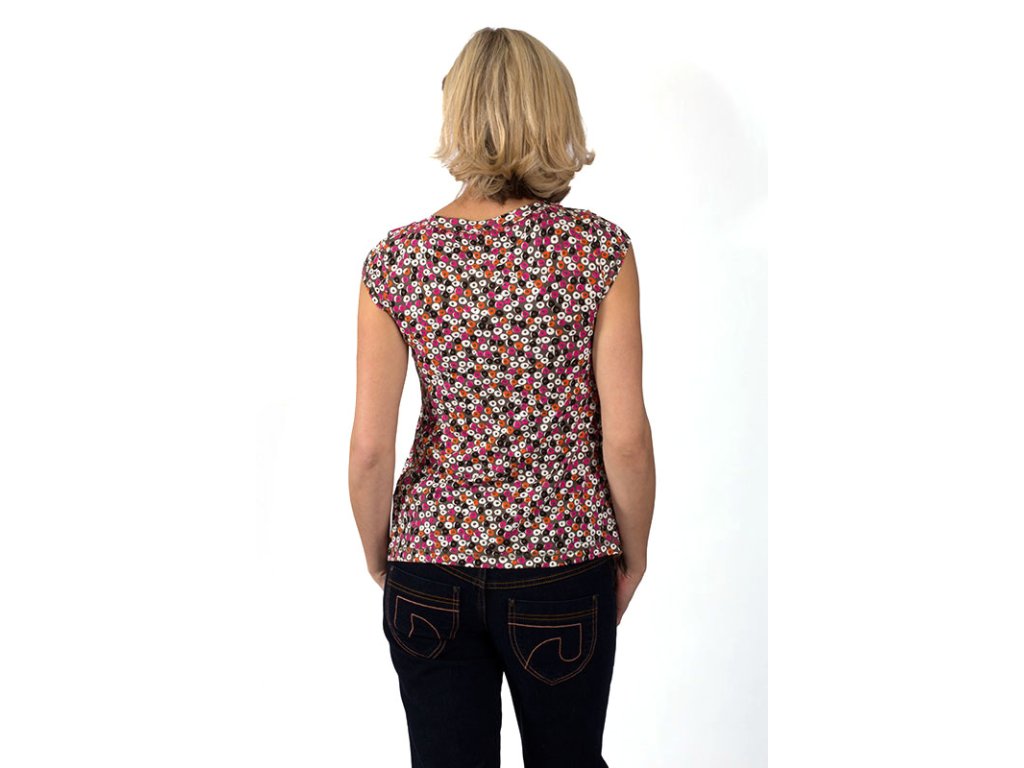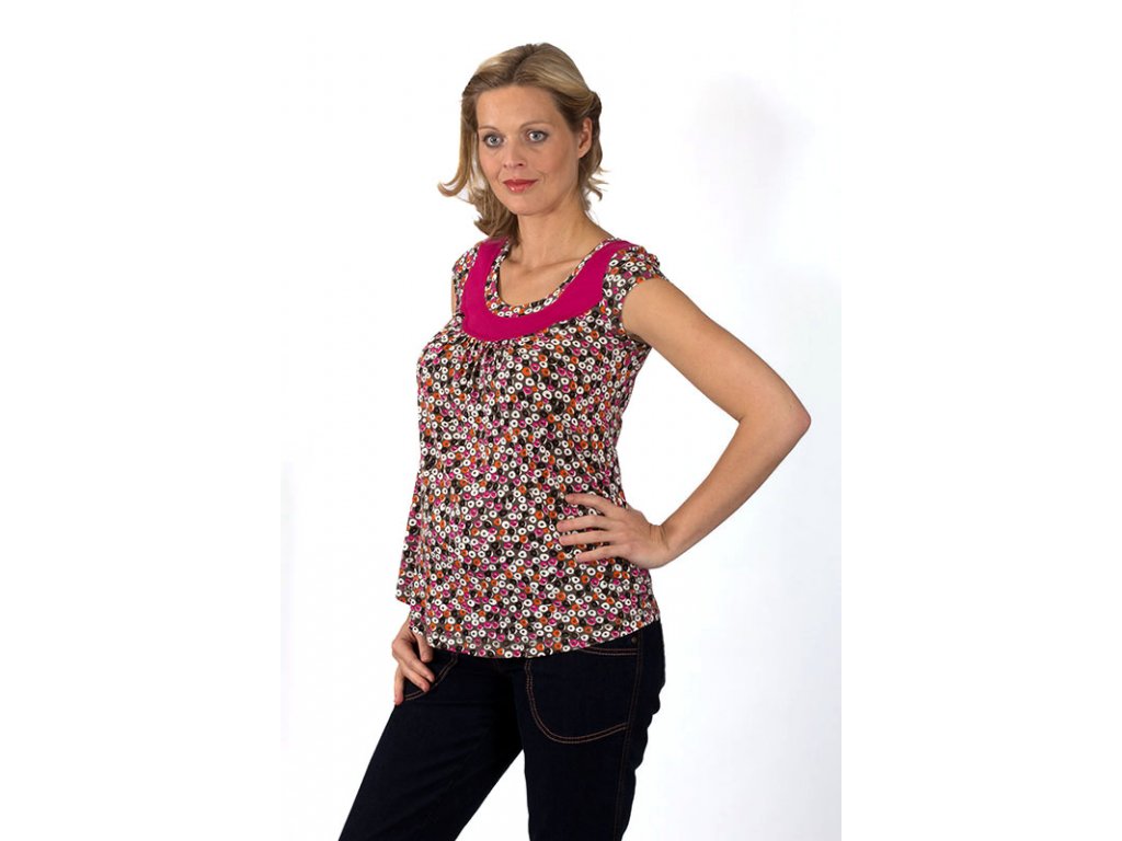 Tehotenské tričko s krátkym rukávom a okrúhlym výstrihom. Predný diel je okolo priekrčníku tvarovaný sedlom, prestrihnutý, nariasený a tým je vytvorená voľnosť pre bruško.