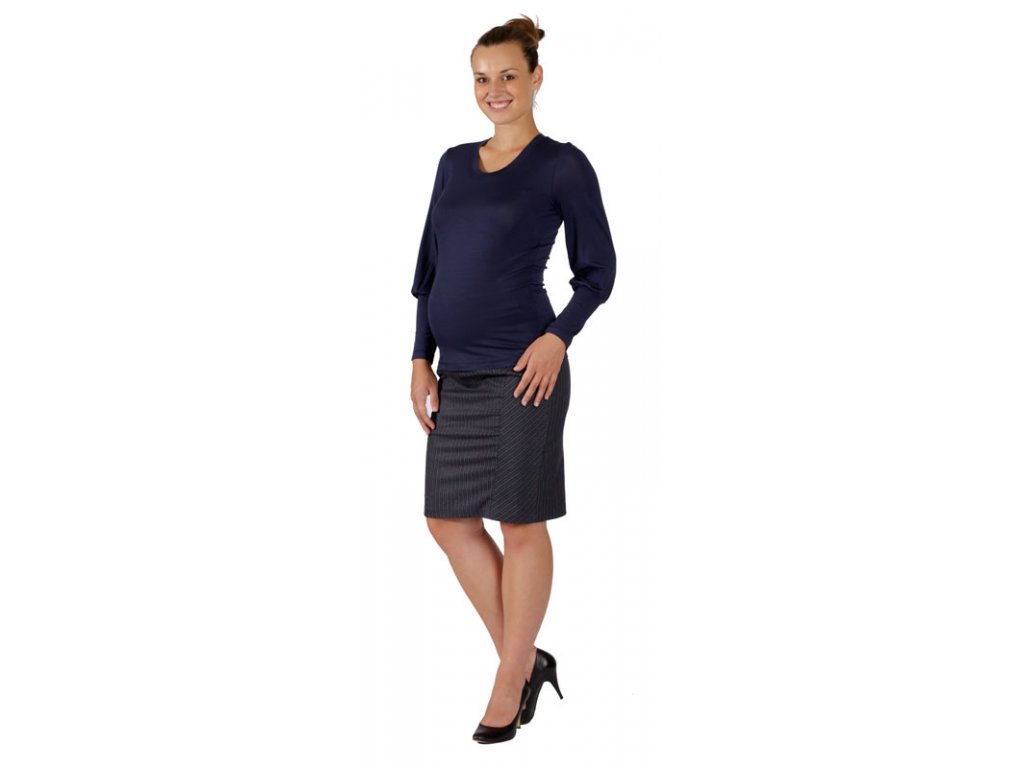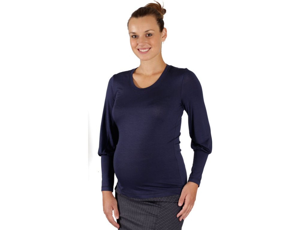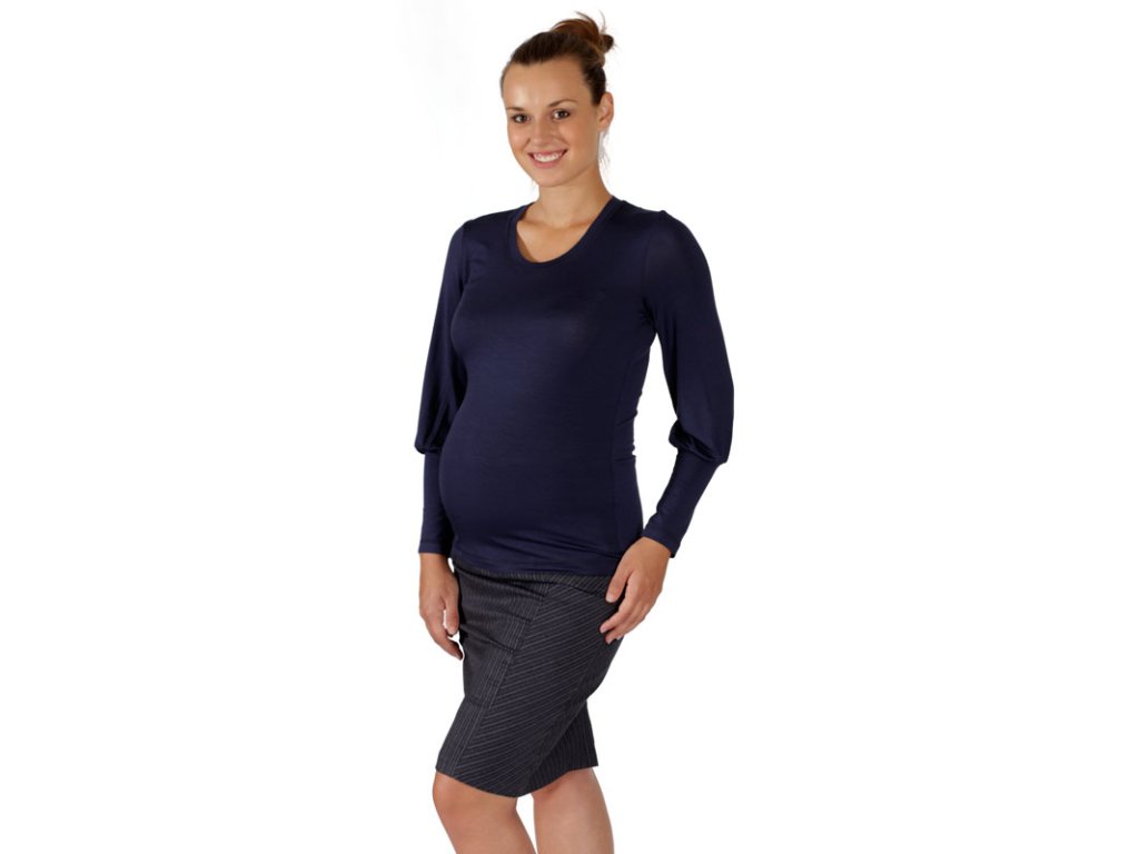 Elegantné tehotenské tričko so zaujímavo riešenými rukávmi. Tričko je vyrobené z jemného viskózového materiálu s ľahkým leskom. Má okrúhly výstrih s úzkym lemom a je ozdobne prešitý. Tričko je áčkovej siluety, dlhé voľnejšie rukávy sú ukončené vysokou manžetou, do ktorej sú ľahko nabraté. Vďaka použitému materiálu je tričko vhodné aj ku slávnostnejším príležitostiam. Využiteľné aj po období tehotenstva.