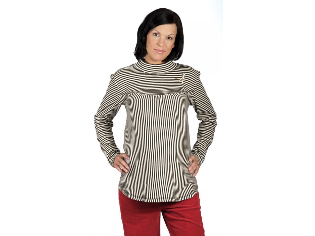 Veľmi pekné a príjemné bavlnené tehotenské tričko s nízkym stojačikom. Predný diel je členený sedlom nad prsiami, do ktorého je predný diel nariasený, čím vznikne viac voľnosti pre rastúce bruško. Má dlhý rukáv.