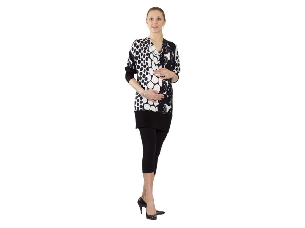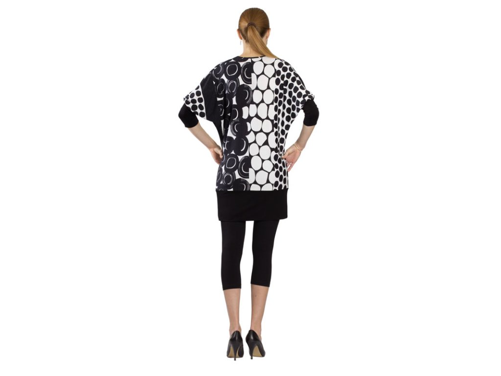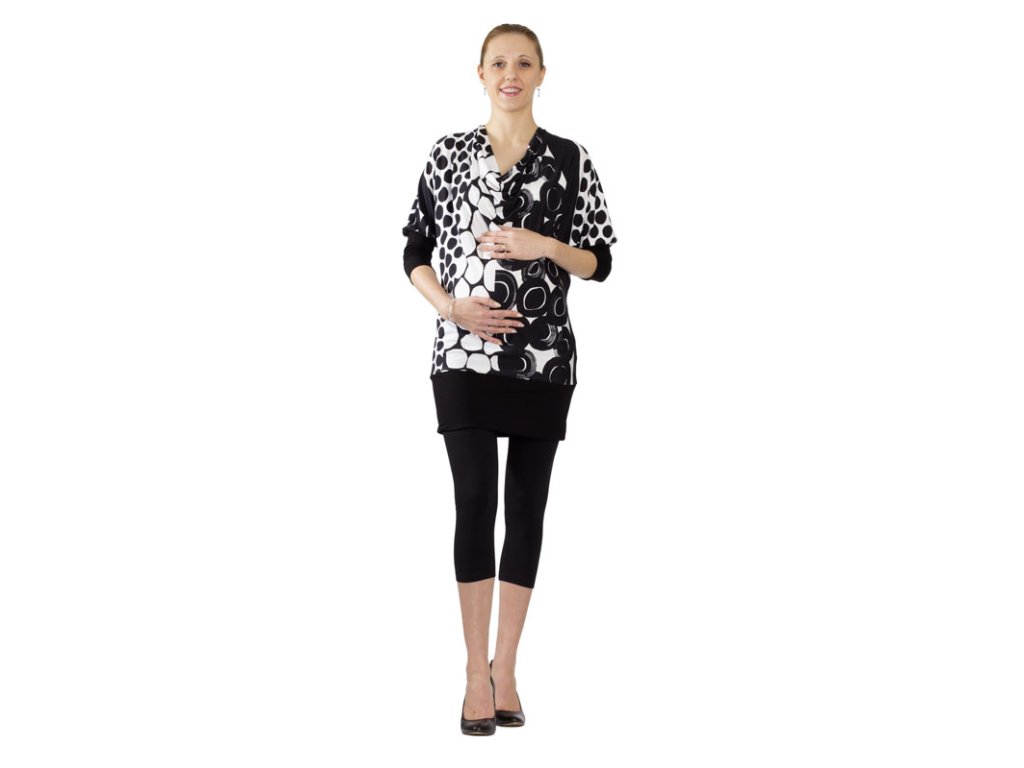 Multifunkčné predĺžené tričko čiernej farby s netopirími rukávmi, výstrihom typu "voda" a širokými manžetami. Manžety sú široké 15 cm. Zadný diel je členený stredovým švom. Skvelo ho využijete aj po pôrode. Tričko môžete nosiť k nohaviciam, legínam, alebo aj ako samostatné kratšie šaty. :)