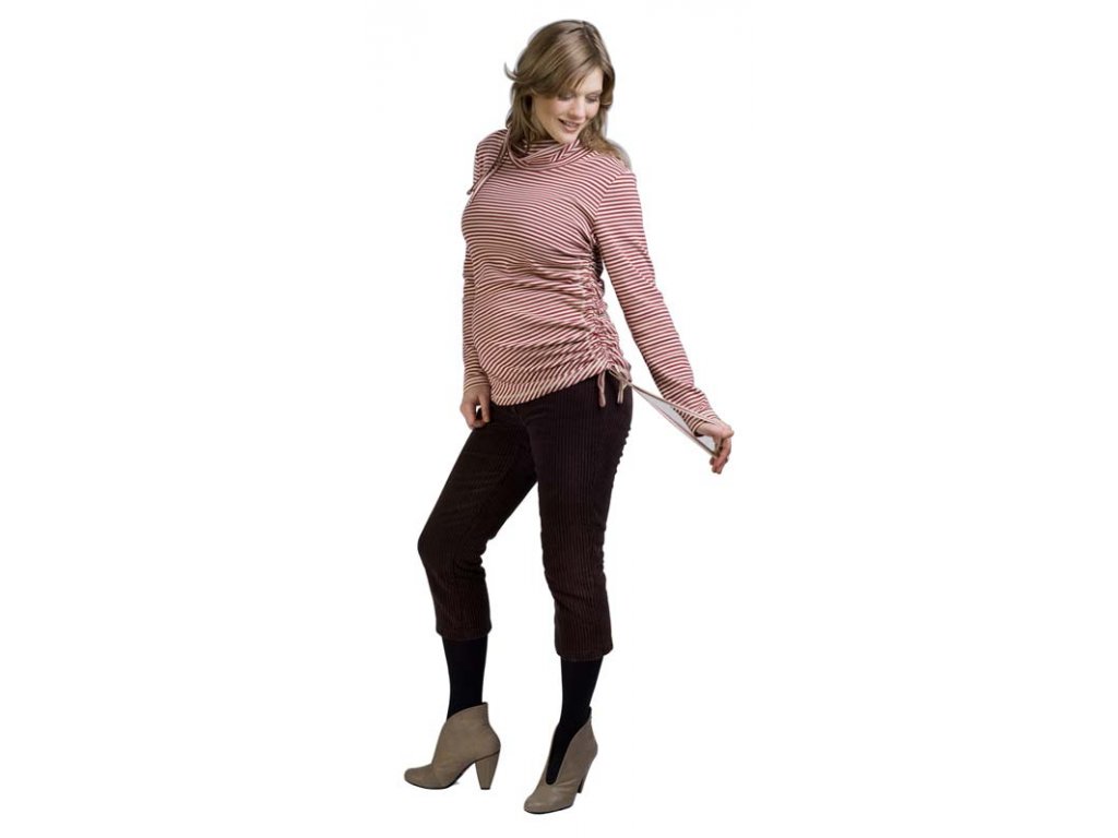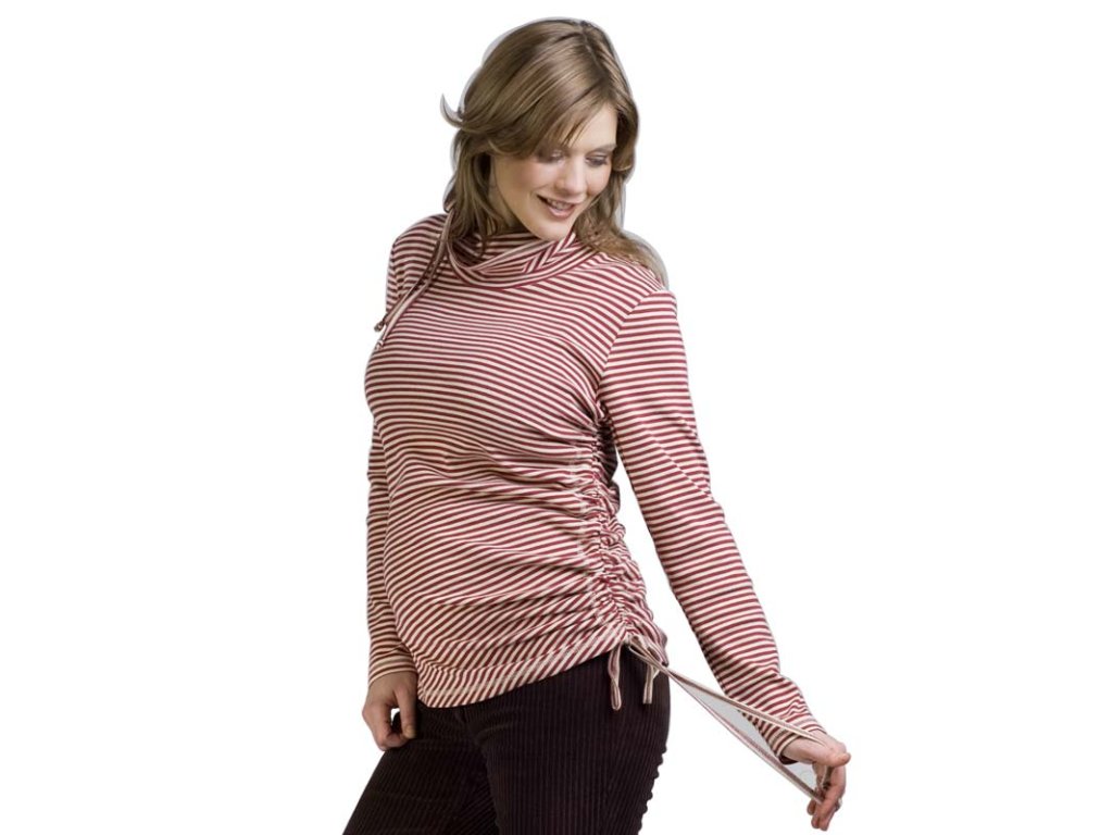 Veľmi pohodlné bavlnené tehotenské tričko z mäkkého rebrového úpletu so sťahovaním na jednom boku a vysokým stojačikom so sťahovaním na opačnej strane.