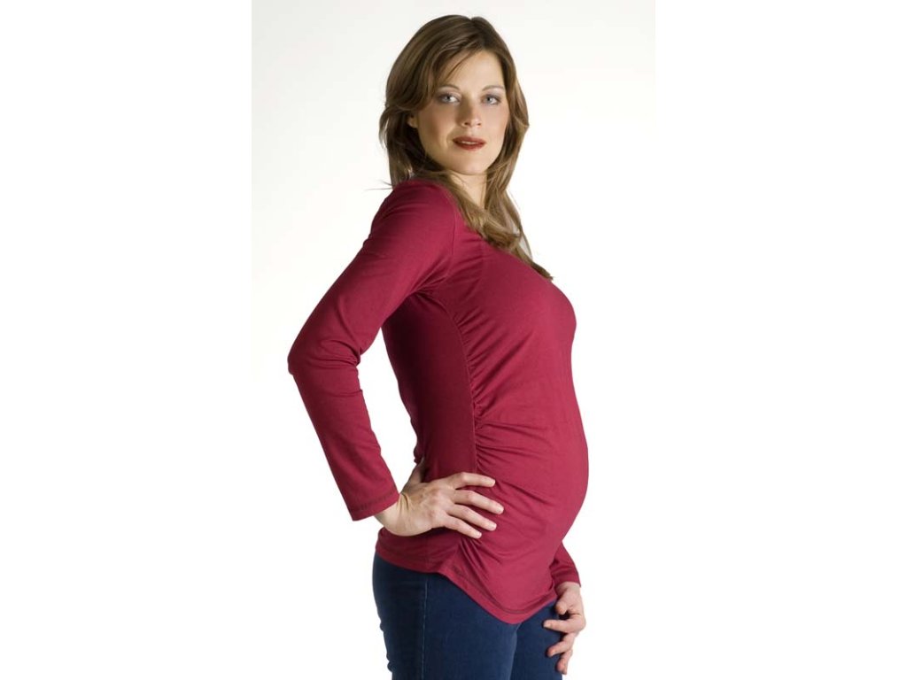 Veľmi príjemné tehotenské tričko s okrúhlym výstrihom a riasením predného dielu v oboch bočných švoch.