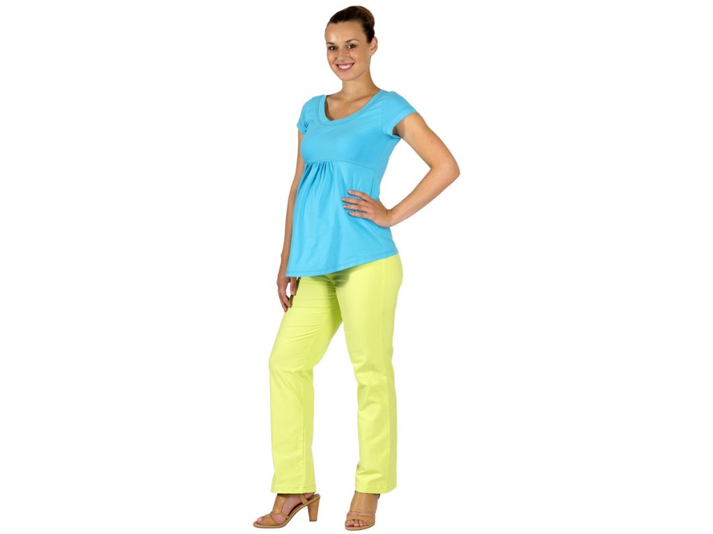 Veľmi príjemné tehotenské tričko s riasením na bruško, hlbším výstrihom a krátkymi rukávmi, ktoré sú rovnako ako výstrih ukončené širším lemom a ozdobne prešité. Predný diel je podstrihnutý pod prsiami, spodná časť je predĺžená a nariasená pre voľnosť rastúceho bruška.