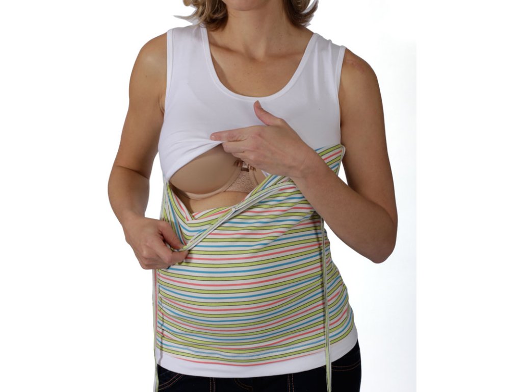 Tehotenský a dojčiaci top. Mierne riasené v bočných švoch, kde vznikne priestor pre rastúce bruško. Vrchný predný diel je dvojitý (vrchný PD sa zaväzuje za krkom), čo umožňuje dojčenie.