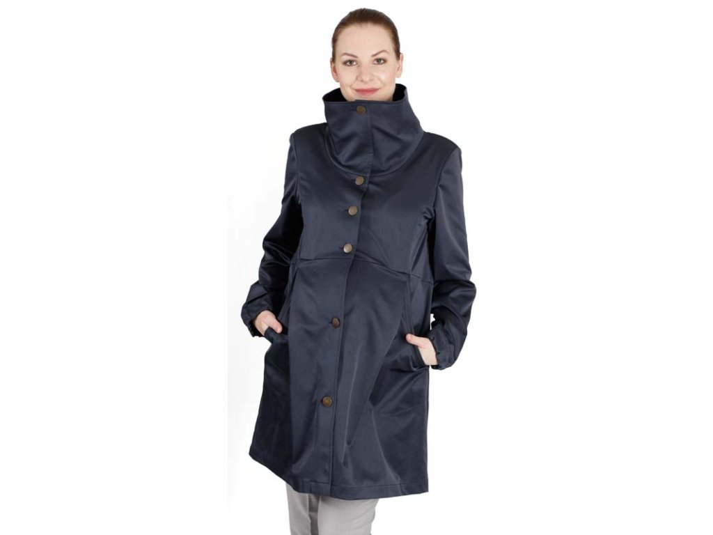 Ľahký tehotenský baloniak s veľkým stojatým golierom a priestrannými vreckami na prednom diele.