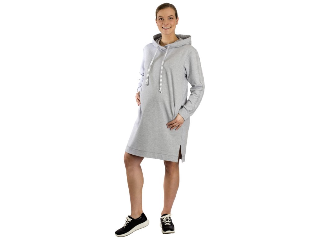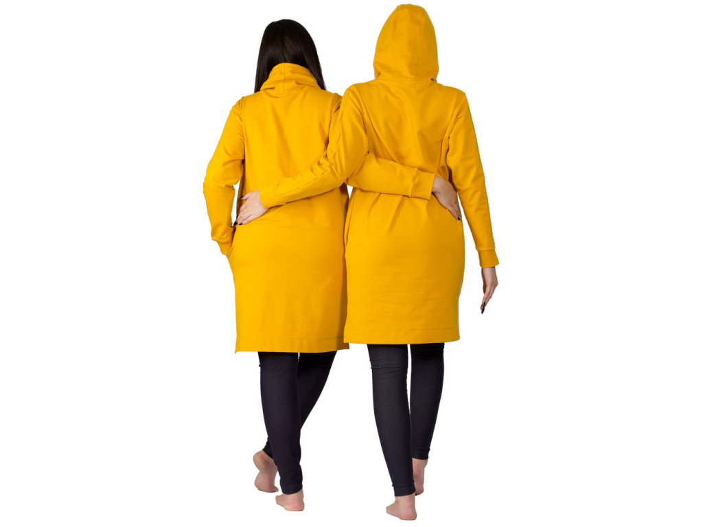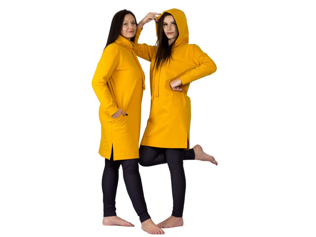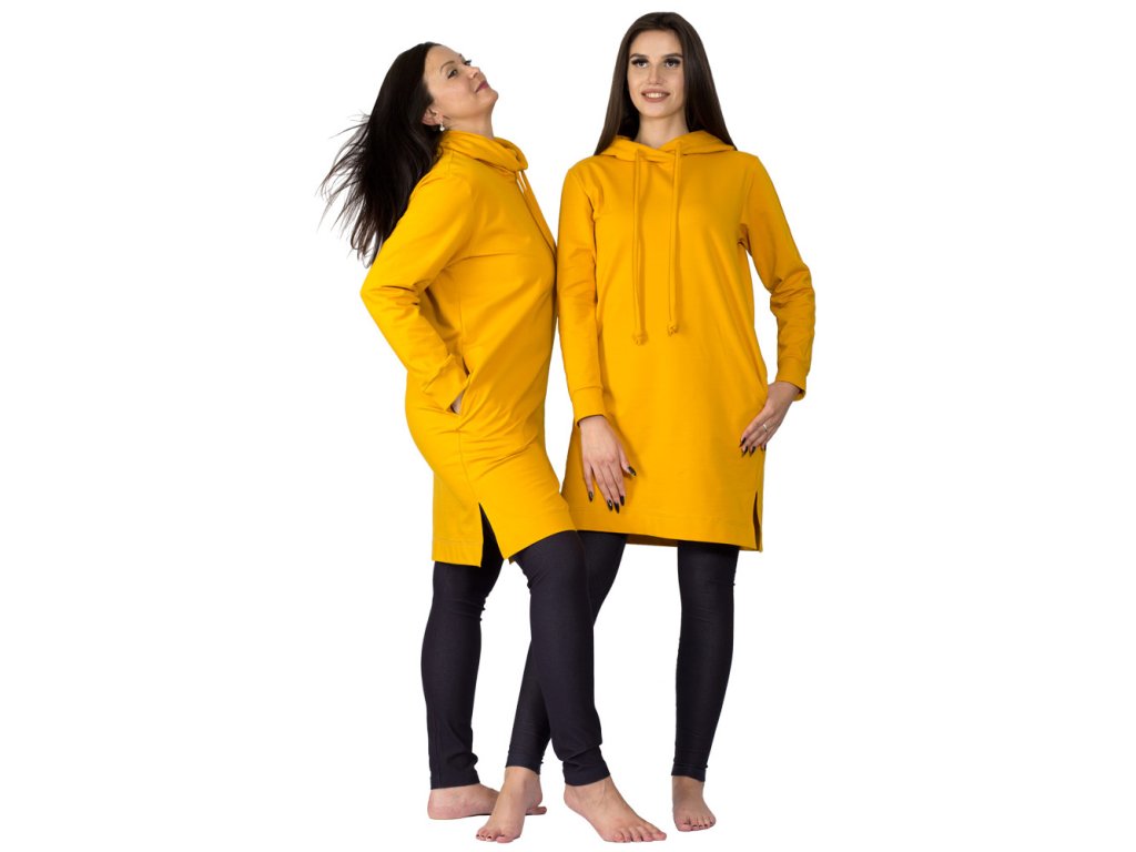 Pohodlné, nielen tehotenské mikinošaty športovo elegantného štýlu s kapucňou a priestrannými vreckami v bočných švoch. Na kapucni je ozdobne prešitý stredový diel. Na rukávoch sú ozdobne prešité ozdobné prúžky a sú ukončené manžetou. V spodnej časti bočných švov sú rázporky pre väčšiu voľnosť pohybu. Mikinošaty sú vyrobené z obľúbenej mäkkej bavlnenej teplákoviny horčicovej farby.