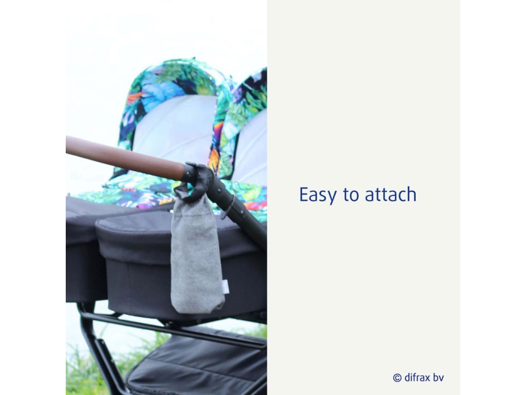 Difrax Termoobal je vyrobený zo špeciálneho filmu izolujúceho teplo a chlad. Termoobal je možné použiť aj pre uchovávanie namiešanej mliečnej stravy v chladných podmienkach. Obal na fľaštičku z odolného materiálu ju uchová teplú, alebo studenú vďaka izolačnej fólii a špeciálnym termo vlastnostiam až dve hodiny. Termoobal sa dá pomocou popruhov na suchý zips prichytiť na kočík