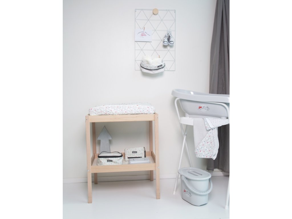 Pri prebaľovaní, na komode alebo po kúpaní je vždy potrebné veľa pomôcok pre starostlivosť o dieťa. Napríklad hrebeň a kefa, manikúru, krém, mlieko alebo tiež plienky. Všetky tieto veci môžete mať na jednom mieste v trendy textilnom košíku od Bébé-Jou.