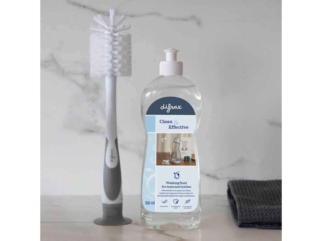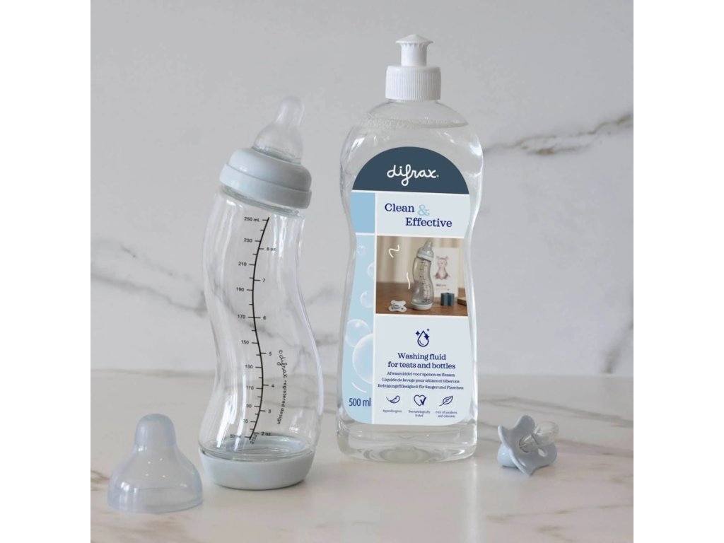 Umývací prostriedok Difrax je špeciálne vyrobený pre bezpečné umývanie fliaš, cumlíkov, cumlíkov a umývateľného príslušenstva. Tekutina je hypoalergénna, bezfarebná a obsahuje prírodné zložky. Už s malým množstvom účinne odstránite zvyšky mlieka a kaše na dojčenských fľašiach a ďalšom príslušenstve.