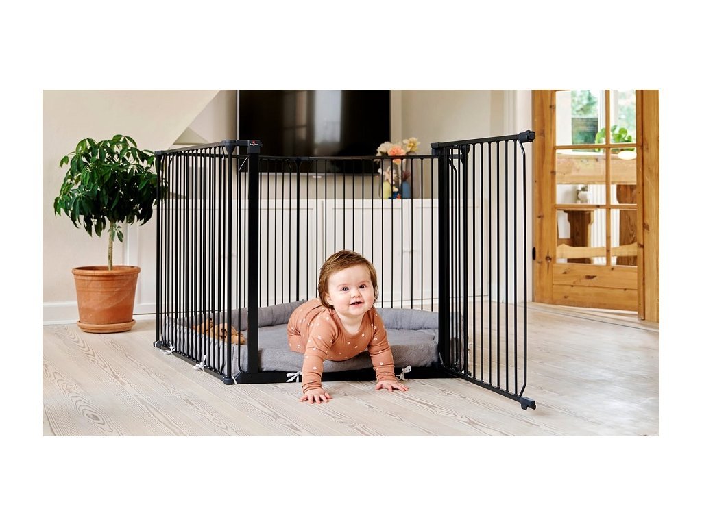 Ohrádku Carl je možné ľahko premeniť na bezpečnostnú zábranu, zábranu ku krbu alebo prepážku miestnosti, ako vaše dieťa rastie a vyžaduje viac priestoru. Jednoducho pridajte nástenné držiaky (predávajú sa samostatne) a môžete vo svojom dome vytvoriť zábranu až do 350 cm. Ohrádkou aj zábranou môžete ľahko prejsť pomocou širokých dverí, ktoré je možné otvoriť z oboch strán jednou rukou – užitočná funkcia v uponáhľanom živote. Vďaka svojmu flexibilnému dizajnu a robustnej konštrukcii je BabyDan Carl spoľahlivým riešením na vytvorenie bezpečného prostredia aj vo väčších priestoroch. Možno neobmedzene predlžovať pomocou ľubovoľného počtu predĺžení (33 alebo 72 cm predĺženie sa predávajú zvlášť)